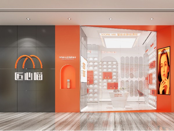 圓潤的線條與溫暖的色彩組合,將靈動與精致裝載于高貴奢華的空間中。對稱、重復的圖形裝飾,豐富著門店裝修設計的層次感。大面積的灰白色詮釋著現代主義的簡約美,局部的高飽和橙色又能瞬間抓住客戶的視線焦點,從簡單的空間配色設計就能將個性高端美容店應有的輕奢感表達到極致,十分符合高消費水平人群的小眾審美。