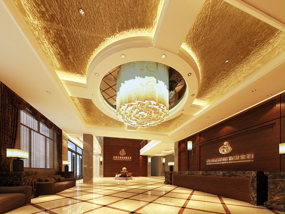 金黃色的裝潢,富麗堂皇。這是進到這家酒店的第一印象,天花頂是一個牡丹狀的雕塑,利用形狀的來進行空間光源的分配,再加上金黃色地板磚的反襯,整個空間眼前一亮。