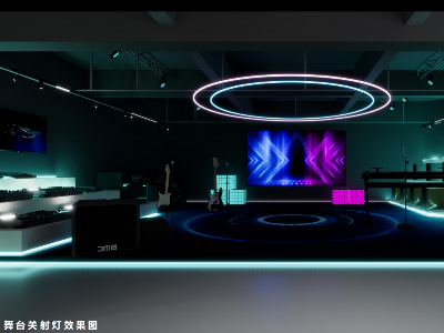 舞臺區(qū)域的設(shè)計融合了動感和現(xiàn)代氛圍,眾多射燈照亮整個空間,電音設(shè)備營造出歡快的氣氛,工業(yè)風(fēng)格的天花吊頂和巨大的圓形燈具,讓整個空間充滿了未來感和科技的魅力。