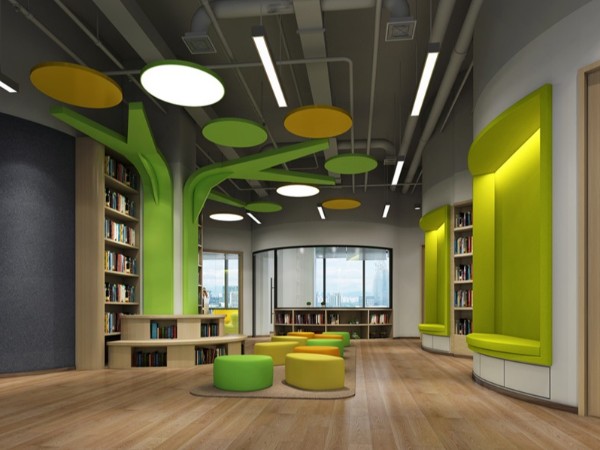 閱讀區(qū)以綠色和原木色為主,營(yíng)造一個(gè)溫馨、安靜的閱讀氛圍。吊頂與裝飾相互呼應(yīng),似枝繁葉茂的大樹(shù),也寓意著孩子能夠發(fā)散思維,知識(shí)獲得延展。同時(shí),萬(wàn)綠叢中一點(diǎn)紅,讓空間增添了一抹奇思妙想。深圳培訓(xùn)機(jī)構(gòu)室內(nèi)裝修設(shè)計(jì)