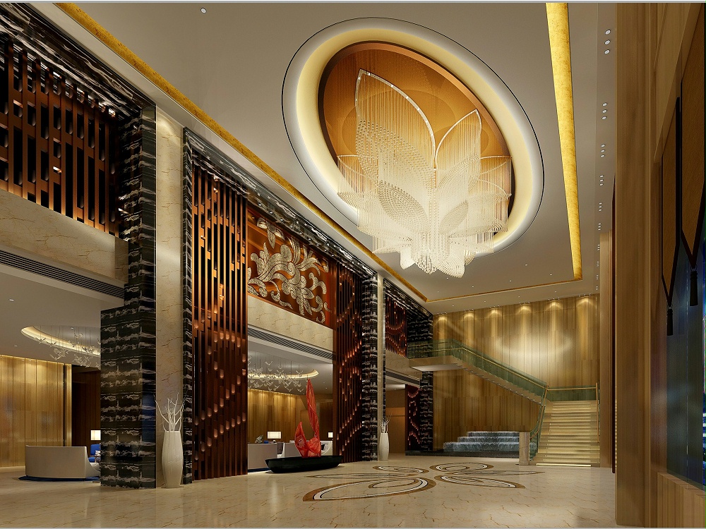 前廳裝修風格富麗、充滿著強烈的動感效果,加上現(xiàn)代色調(diào)的渲染,以及優(yōu)雅配飾融入,讓酒店整體視覺感盡顯時尚奢華風。古典的地面紋路、材質(zhì)和色調(diào)穩(wěn)重細膩不失精美典雅,精致奢華的吊燈,融入暖黃燈光,不僅提亮了空間的色調(diào)視覺感,并給沉穩(wěn)的空間增添了優(yōu)雅浪漫的氣氛。酒店裝修效果圖